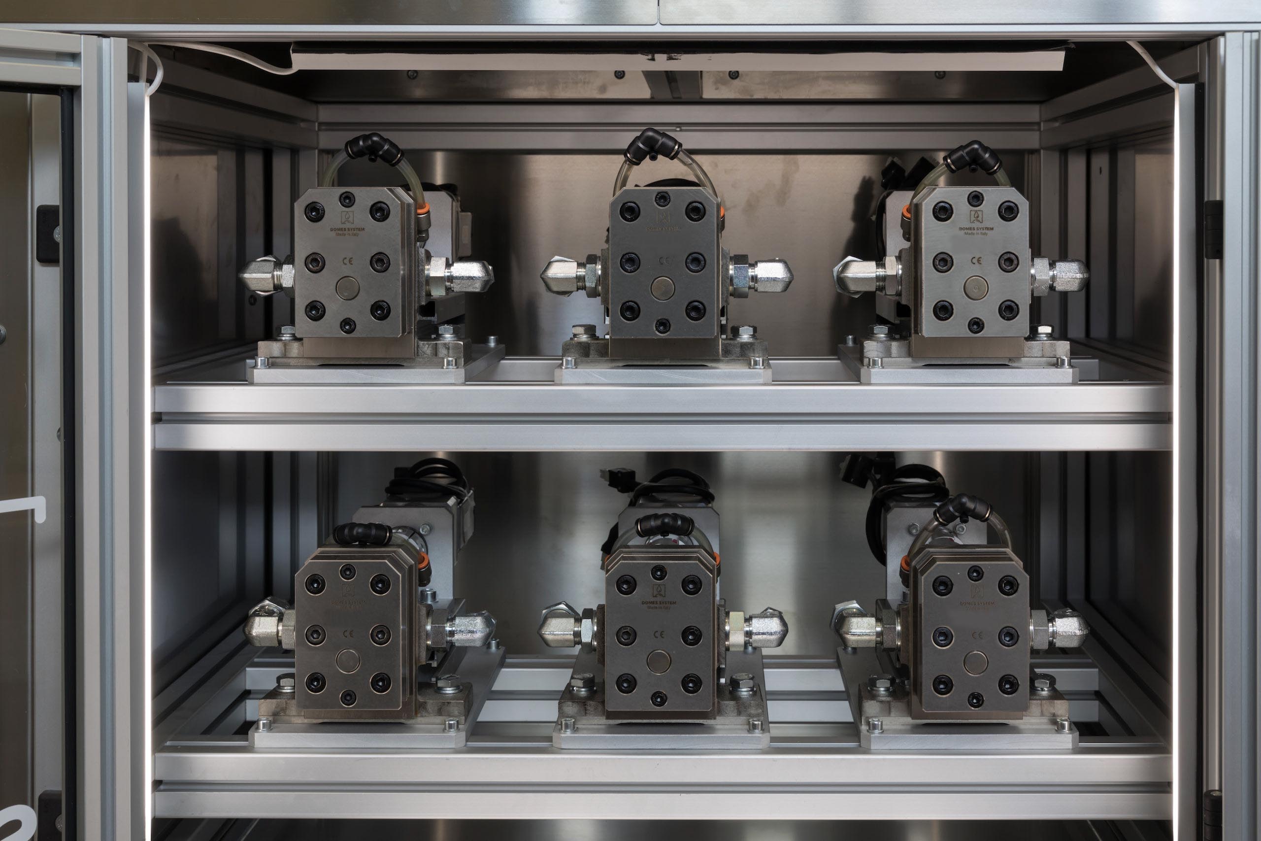 Metering group is based on precise gear pumps, which are ideal in the application since they allow a variable mixing ratio with a continuous and precise material flow. The continuous flow avoids recharging cycles, ensuring accuracy in the ratio among the different ingredients. Additionally, the gear pumps can deliver a steady large amount of resin, which allows an efficient use of multi-nozzles dispensing heads. The gear pumps size is tailored according to the application and different size pumps can be used, even on the same ingredients, in order to match the most challenging multicomponent recipes. Pumps are managed by fully autonomous drives, which are linked through a closed loop control for precise variable ratio capability, easily controlled by PLC. Gear pumps rotations are interpolated with the robotic dispensing unit movements, to assure regularity of the dispensed resin.